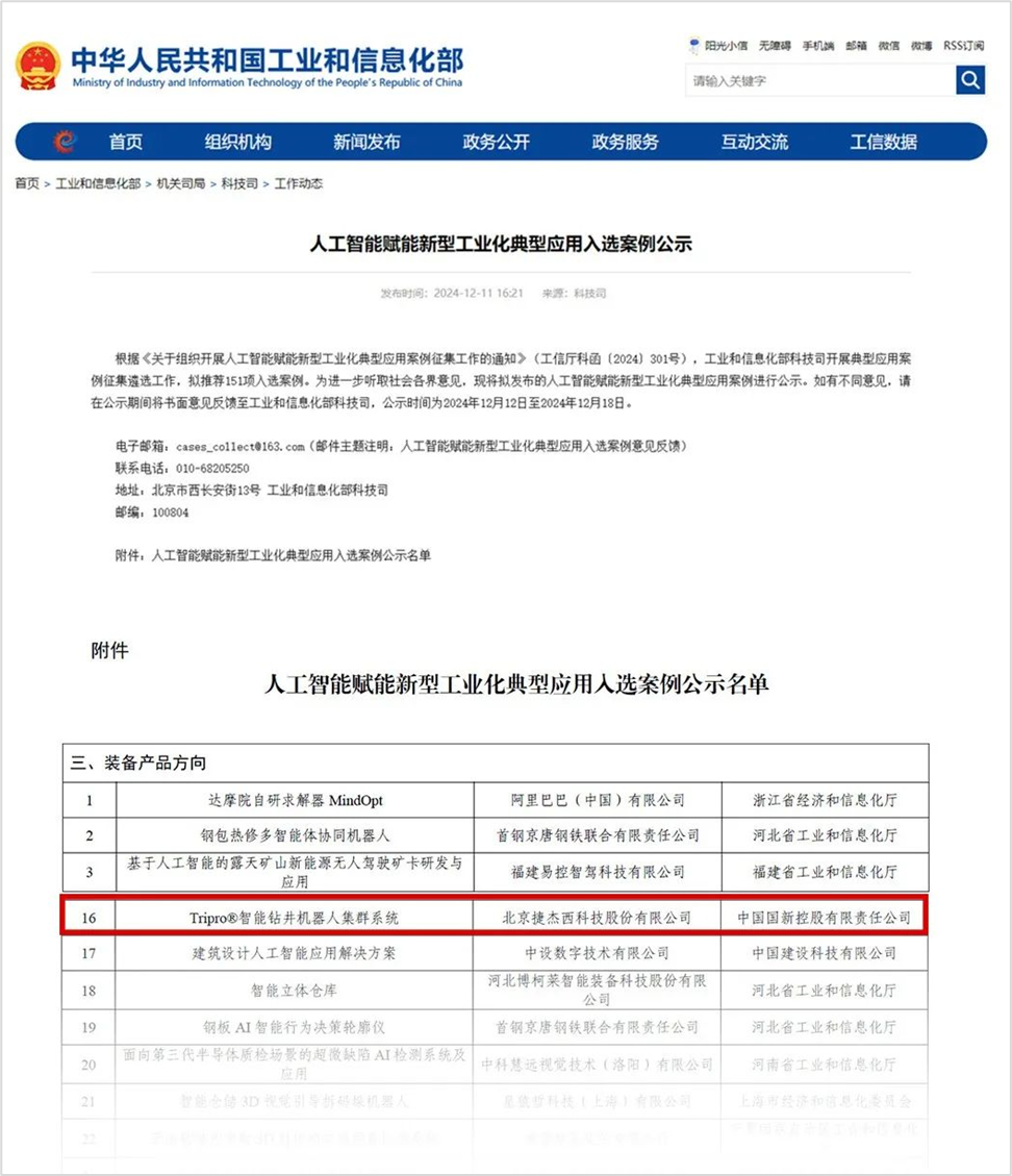 近日,工業(yè)和信息化部科技司公示人工智能賦能新型工業(yè)化典型應(yīng)用入選案例名單,經(jīng)過層層遴選,捷杰西科技“Tripro?智能鉆井機器人集群系統(tǒng)”脫穎而出,入選裝備產(chǎn)品類方向典型案例。
