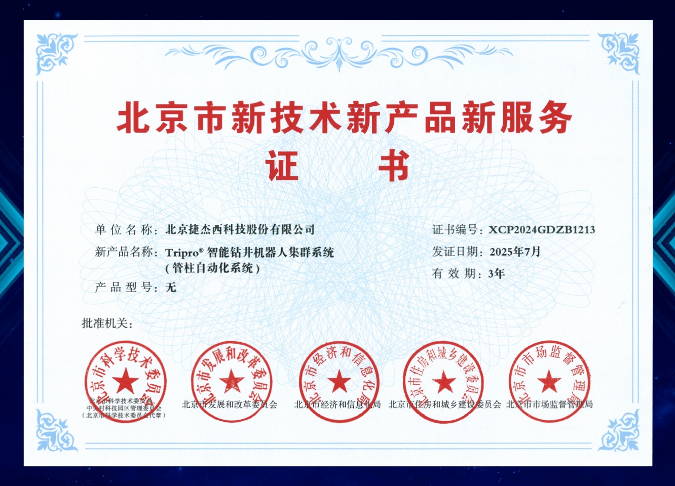 近日,北京市科學(xué)技術(shù)委員會(huì)、中關(guān)村科技園區(qū)管理委員會(huì)等部門(mén)聯(lián)合發(fā)布了北京市新技術(shù)新產(chǎn)品新服務(wù)(總第二十批)公示名單。捷杰西自主研發(fā)的Tripro?智能鉆井機(jī)器人集群系統(tǒng)(管柱自動(dòng)化系統(tǒng))憑借其創(chuàng)新技術(shù)與先進(jìn)性,成功入選該名單。